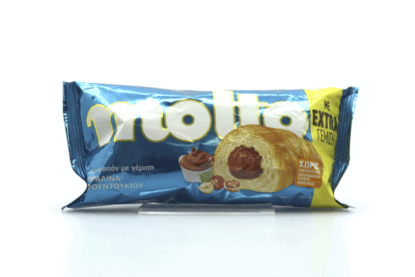 Κρουασάν με γέμιση πραλίνα φουντουκιού. Συστατικά: Ζύμη: αλεύρι σίτου, φυτικά έλαια (φοινικέλαιο, ηλιέλαιο), ζάχαρη, σιρόπι γλυκόζης-φρουκτόζης, μαγιά, αλάτι, σταθεροποιητής (μόνο- και διγλυκερίδια των λιπαρών οξέων), βανιλλίνη, μέσο οξίνισης (κιτρικό οξύ). Γέμιση πραλίνα φουντουκιού 33%: ζάχαρη, φοινικέλαιο, άπαχο γάλα σκόνη, αποβουτυρωμένο κακάο σκόνη, φουντούκια, γαλακτωματοποιητές (μόνο- και διγλυκερίδια λιπαρών οξέων, λεκιθίνη ηλιελαίου), βανιλλίνη. Η γέμιση πραλίνα φουντουκιού περιέχει 8% αποβουτυρωμένο κακάο σκόνη και 6% φουντούκια.Παράγεται σε εργοστάσιο που διαχειρίζεται ως πρώτες ύλες: αυγά, αραχίδες, αμύγδαλα, φυστίκια, καρύδια πεκάν,σουσάμι, σέλινο. Διατηρείται σε δροσερό και ξηρό μέρος
