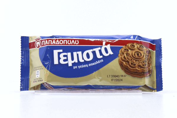 Μπισκότα γεμιστά με κρέμα με γεύση σοκολάτα (30%) Συστατικά: Αλεύρι σίτου, ζάχαρη, φυτικά έλαια (φοινικέλαιο, φοινικοπυρηνέλαιο, έλαιο καριτέ), λακτόζη, αποβουτυρωμένο κακάο σε σκόνη 3,5%, χρωστική (εναμμώνιο καραμελόχρωμα), σιρόπι γλυκόζης-φρουκτόζης, άμυλο, πρωτεΐνες γάλακτος, αποβουτυρωμένο γάλα σε σκόνη, αλάτι, διογκωτικά αρτοποιίας (όξινο ανθρακικό νάτριο, όξινο ανθρακικό αμμώνιο, δισόξινο πυροφωσφορικό νάτριο), γαλακτωματοποιητής (λεκιθίνη σόγιας), αρωματικές ύλες.
