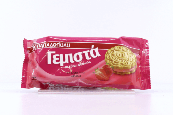 Μπισκότα γεμιστά με κρέμα φράουλα (30%) Συστατικά: Αλεύρι σίτου, ζάχαρη, φυτικά έλαια (φοινικέλαιο, φοινικοπυρηνέλαιο, έλαιο καριτέ), λακτόζη (από γάλα), σιρόπι γλυκόζης-φρουκτόζης, φράουλα σε σκόνη 1,5%, διογκωτικό (ξυλιτόλη), άμυλο, αλάτι, διογκωτικά αρτοποιίας (όξινο ανθρακικό νάτριο, όξινο ανθρακικό αμμώνιο, δισόξινο πυροφωσφορικό νάτριο), γαλακτωματοποιητής (λεκιθίνη σόγιας), φυσική αρωματική ύλη.